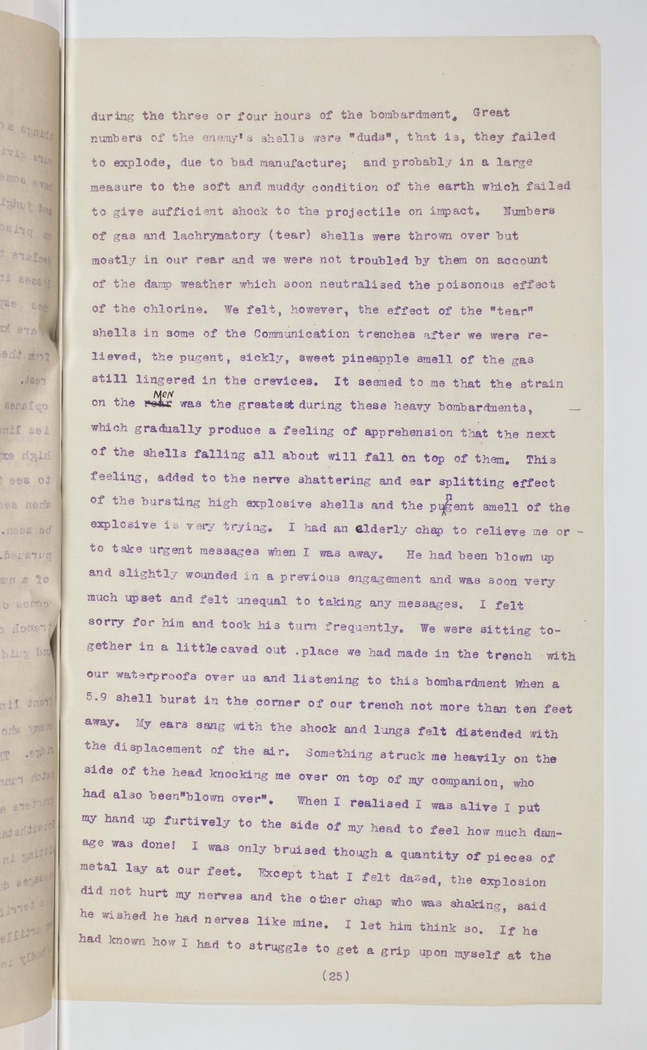 during the three or four hours of the bombardment. Great numbers of the enemy's shells were "duds", that is, they failed to explode, due to bad manufacture; and probably in a large measure to the soft and muddy condition of the earth which failed to give sufficient shock to the projectile on impact. Numbers of gas and lachrymatory (tear) shells were thrown over but mostly in our rear and we were not troubled by them on account of the damp weather which soon neutralised the poisonous effect of the chlorine. We felt, however, the effect of the "tear" shells in some of the Communication trenches after we were relieved, the pugent, sickly, sweet pineapple smell of the gas still lingered in the crevices. It seemed to me that the strain on the men was the greatest during the heavy bombardments, which gradually produce a feeling of apprehension that the next of the shells falling all about will fall on top of them. This feeling, added to the nerve shattering and ear splitting effect of the bursting high explosive shells and the pungent smell of the explosive is very trying. I had an elderly chap to relieve me or to take urgent messages when I was away. He had been blown up and slightly wounded in a previous engagement and was soon very much upset and felt unequal to taking any messages. I felt sorry for him and took his turn frequently. We were sitting together in a little caved out place we had made in the trench with our waterproofs over us and listening to this bombardment when a 5.9 shell burst in the corner of our trench not more than ten feet away. My ears sang with the shock and lungs felt distended with the displacement of the air. Something struck me heavily on the side of my head knocking me over on top of my companion, who had also been "blown over". When I realised I was alive I put my hand up furtively to the side of my head to feel how much damage was done! I was only bruised though a quantity of pieces of metal lay at our feet. Except that I felt dazed, the explosion did not hurt my nerves and the other chap who was shaking, said he wished he had nerves like mine. I let him think so. If he had known how I had to struggle to get a grip upon myself at the