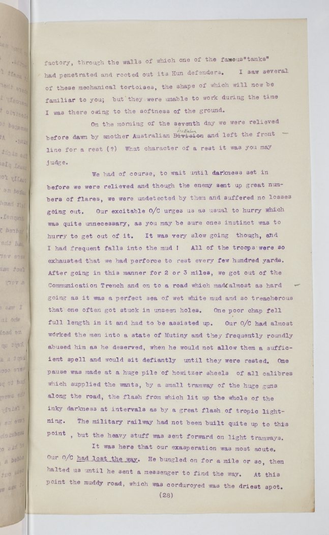 It was here that our exasperation was most acute. Our O/C had lost the way. He bungled on for a mile or so, then halted us until he sent a messenger to find the way. At this point the muddy road, which was corduroyed was the driest spot.