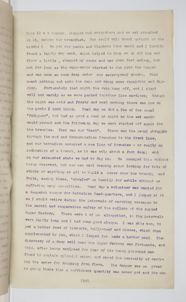 this 12 x 8 Gunyah, slopped mud everywhere and we sat crouched in it, eating our breakfast. One could only kneel upright in the middle! We got our packs and blankets (one each) and I luckily found a fairly dry sack which helped to keep me up off the wet floor a little, changed my socks and was soon fast asleep, but not for long as the rain-water started to run into the Gunyah and was soon an inch deep under our water-proof sheets. That meant getting out into the rain and doing some repairing and digging. Fortunately that night the rain hung off, and I slept well and warmly as we were packed together like sardines; though the night was cold and frosty and next morning there was ice on the pools ¼ inch thick. Next day we did a few of the usual "fatigues", but had as good a rest at night as the wet earth would permit and the following day we were started off again for the trenches. That was our "Rest". There was the usual struggle through the mud and Communication Trenches to the front line, and our battalion occupied a new line of trenches - or really an indication of a trench, as it was only about a foot deep; and in our exhausted state we had to dig in. We managed this without being observed, but our men went roaming about looking for bits of sticks or anything at all to build a cover over the trench; and Fritz, seeing these, "strafed" us heavily for a while without us suffering many casualties. Next day a volunteer was wanted for a despatch runner for Battalion Headquarters, and I jumped at it as I could retire during the intervals of carrying messages to the warmth and comparative safety of the cellars of the ruined Sugar Factory. There were 8 of us altogether, so the intervals were fairly long and I had some good sleeps. I was able too, to get a better feed of biscuits, bully-beef and cheese, which when supplemented by jam, which I longed for, made a better meal. The discovery of a deep well near the Sugar Factory was fortunate, and this, after being analysed for fear of its being poisoned was found to contain splendid water, and saved the necessity of carrying the water for drinking from Flers. The danger was so great in going there that a sufficient quantity was never got and the men