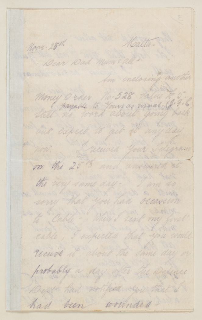 I expect you have looked forward to this note from me – written from Malta. I trust that the cable which it is my intention to send to-morrow to you, will reach you, and serve to dispel any anxiety you may have on my account. I would have cabled you immediately upon my arrival at Malta on the 12th had I had THE necessary consideration. However a friend has discovered the whereabouts of the Pay Office, and to-morrow I shall send the cable – I was wounded on the evening of the 5th Novr.